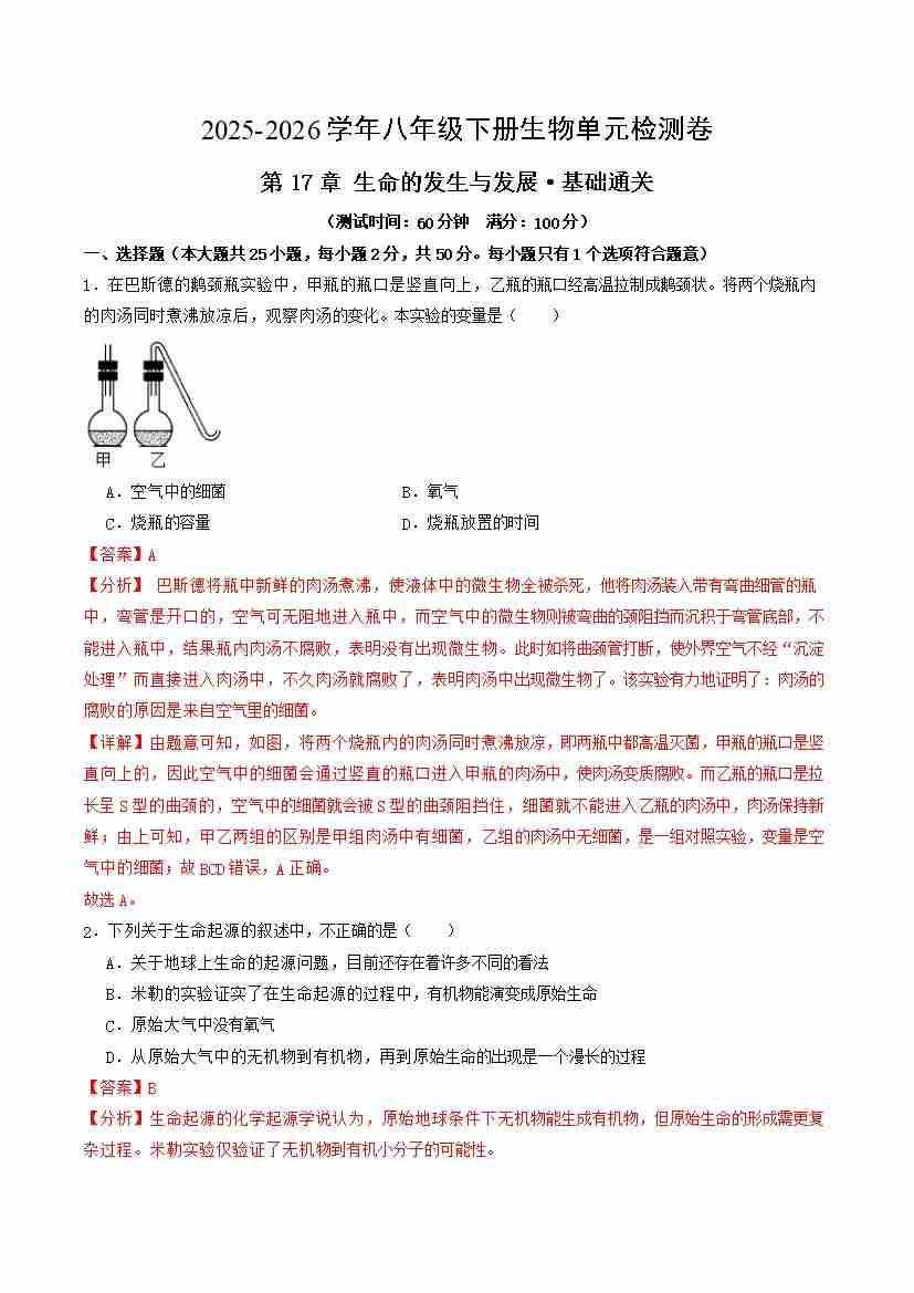 首页 > 全部 > 单元测试 > 第17章 生命的发生与发展(单元测试·基础卷)(解析版)