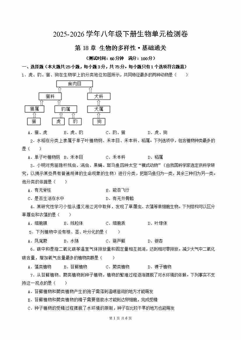首页 > 全部 > 单元测试 > 第18章 生物的多样性(单元测试·基础卷)(考试版A4)
