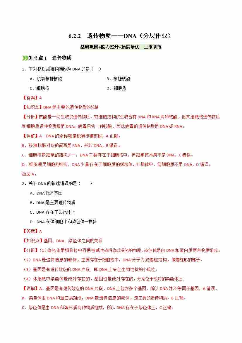 首页 > 全部 > 分层作业 > 6.2.2 遗传物质——DNA(分层作业)(解析版)