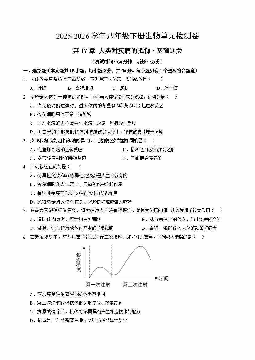 第17章 人类对疾病的抵御(单元测试·基础卷)(考试版A4)