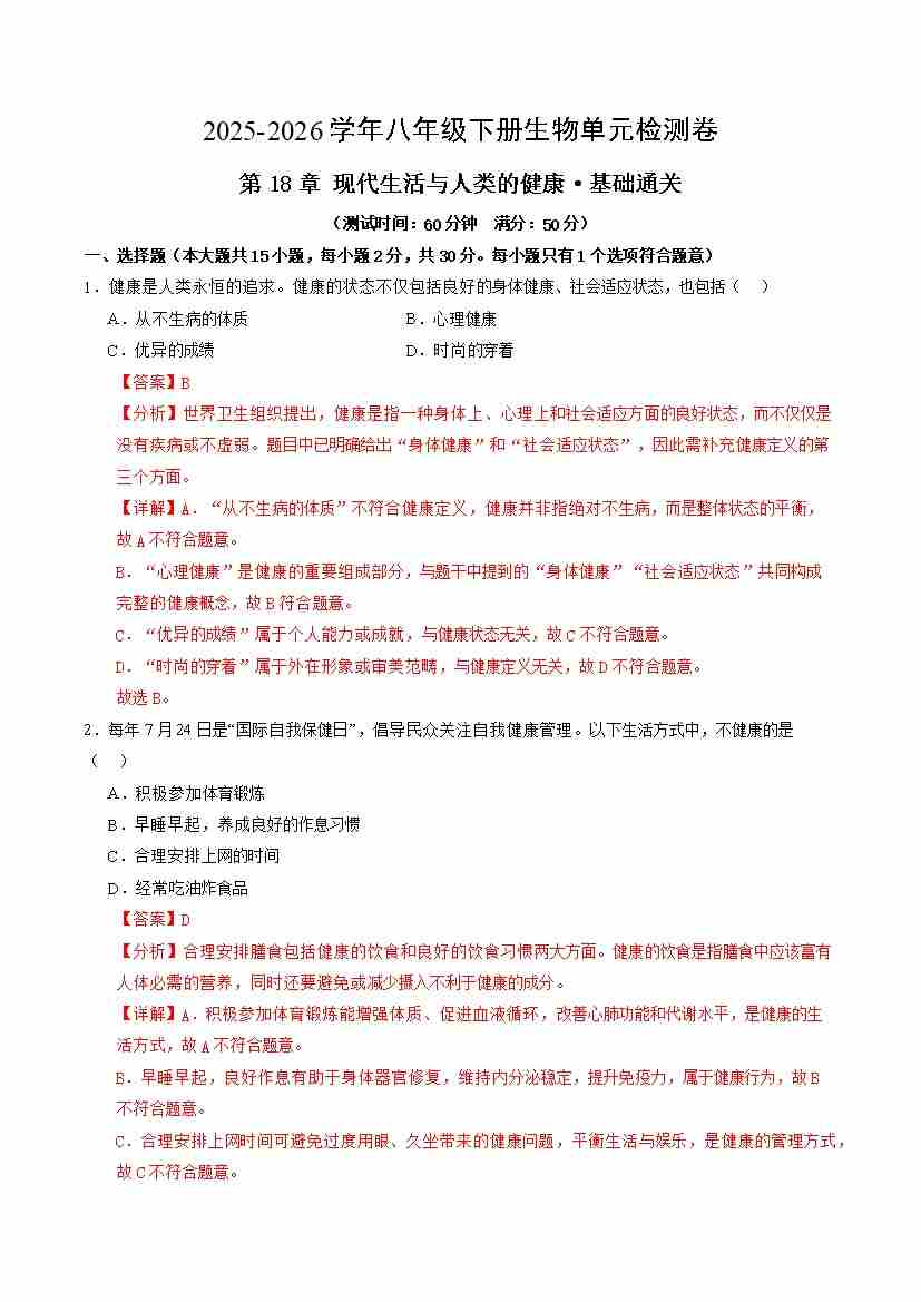 首页 > 全部 > 单元基础卷 > 第18章 现代生活与人类的健康(单元测试·基础卷)(解析版)