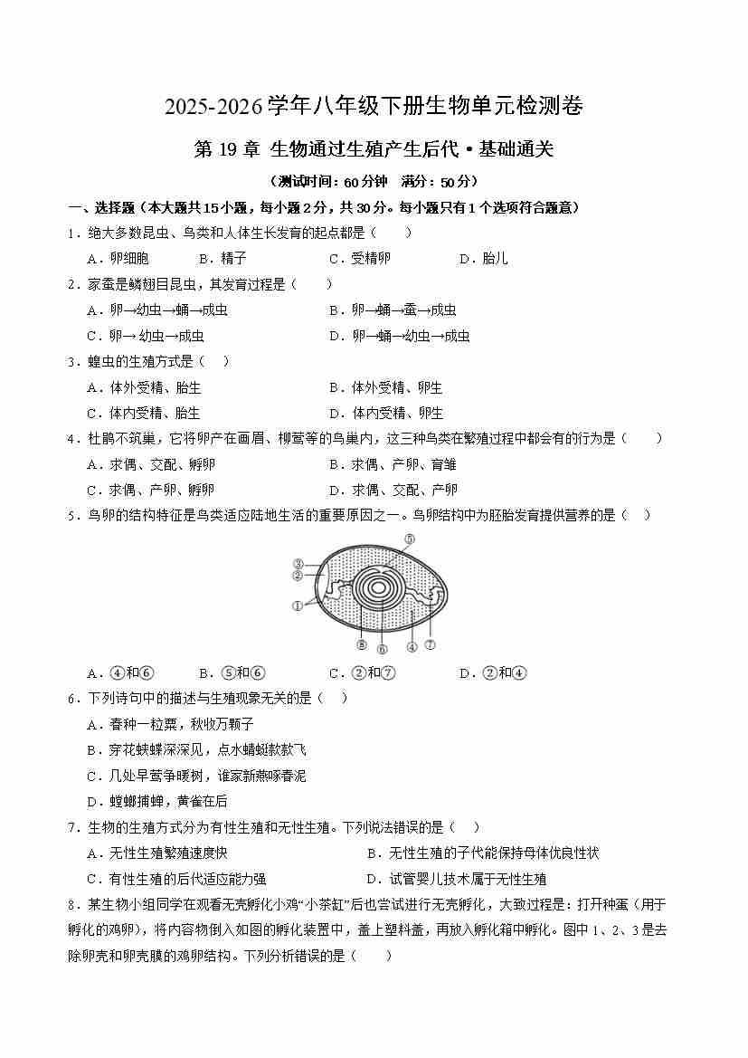 第19章 生物通过生殖产生后代(单元测试·基础卷)(考试版A4)