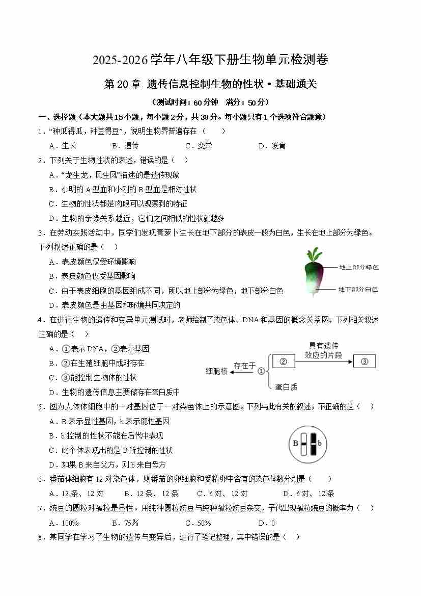 第20章 遗传信息控制生物的性状(单元测试·基础卷)(考试版A4)