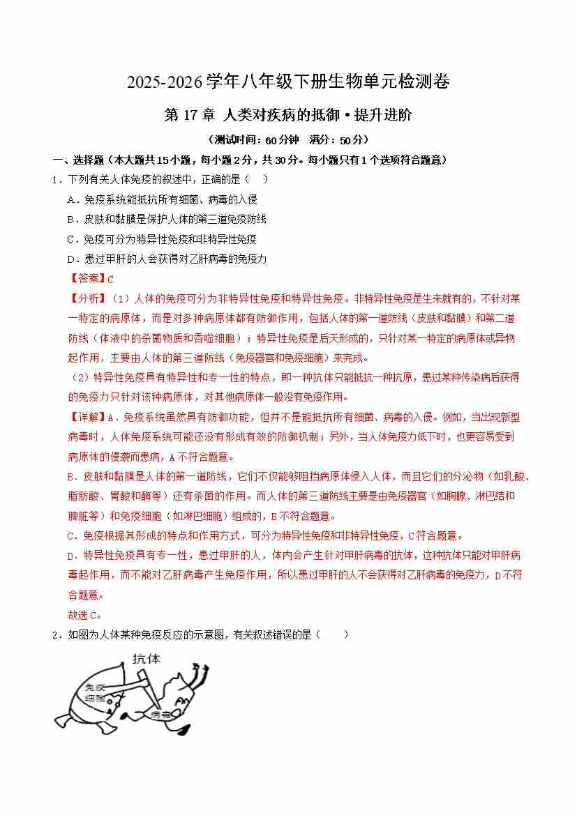首页 > 全部 > 单元提升卷 > 第17章 人类对疾病的抵御(单元测试·提升卷)(解析版)