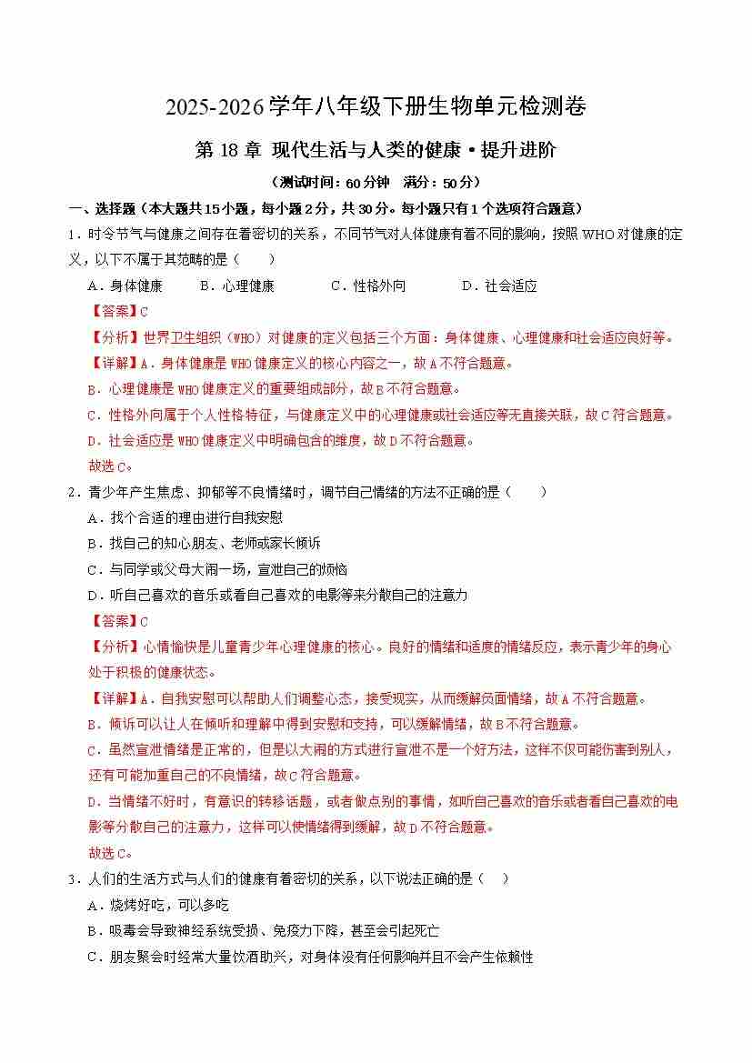 首页 > 全部 > 单元提升卷 > 第18章 现代生活与人类的健康(单元测试·提升卷)(解析版)