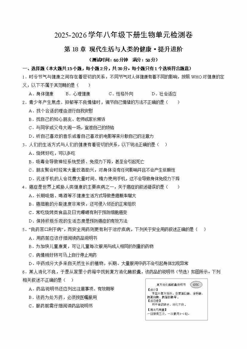 第18章 现代生活与人类的健康(单元测试·提升卷)(考试版A4)