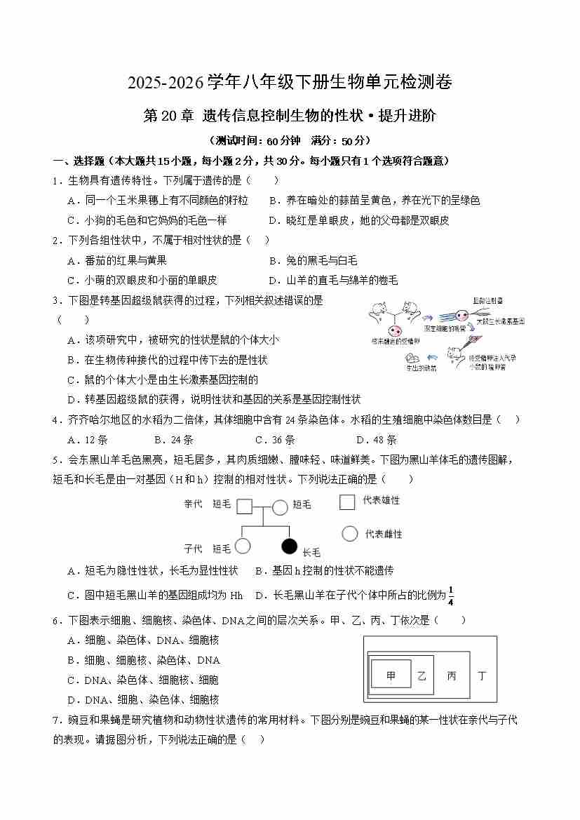 首页 > 全部 > 单元提升卷 > 第20章 遗传信息控制生物的性状(单元测试·提升卷)(考试版A4)