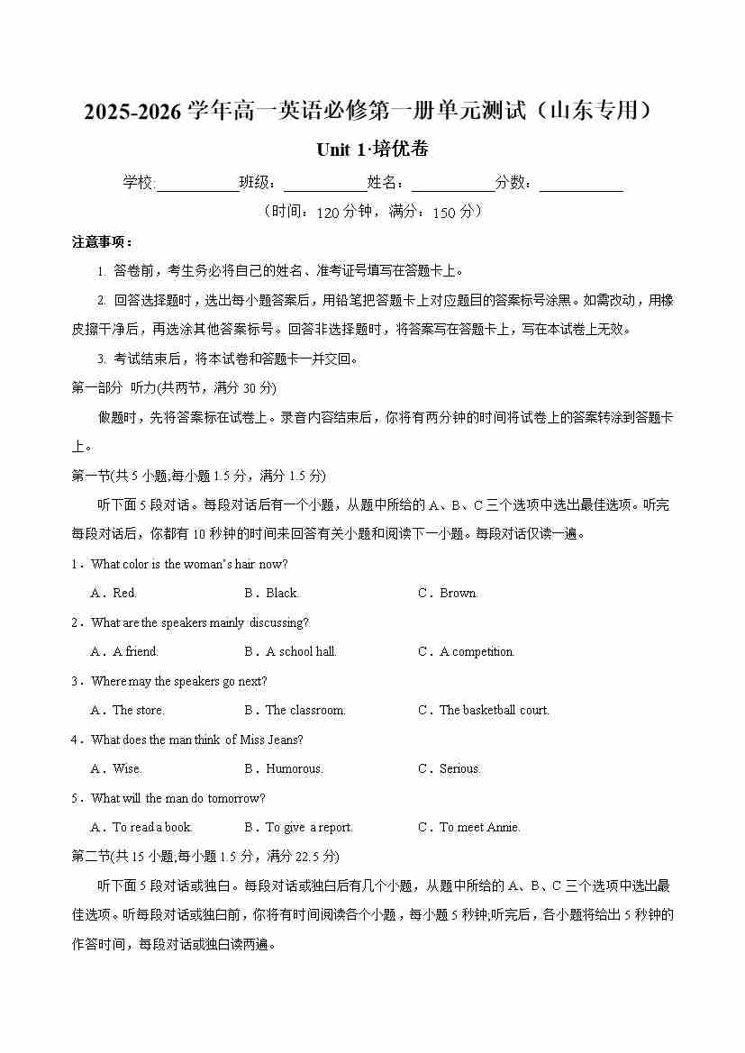 首页 > 全部 > 单元地区卷 > 高一英语必修第一册 Unit1单元测试·培优卷(考试版 A4)