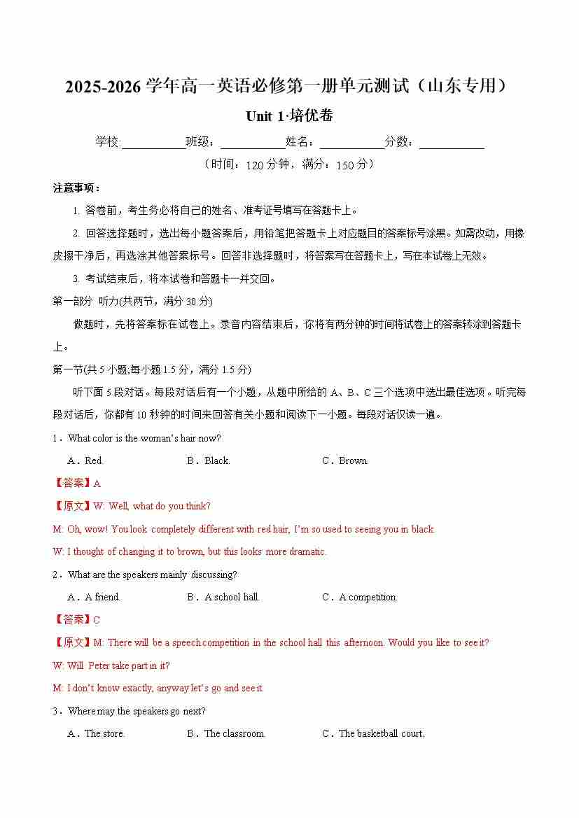 首页 > 全部 > 单元地区卷 > 高一英语必修第一册Unit1单元测试·培优卷(教师版)