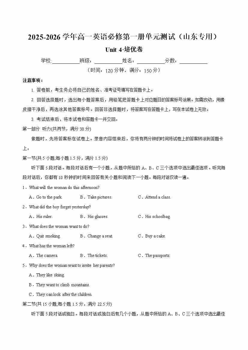 首页 > 全部 > 单元地区卷 > 高一英语必修第一册 Unit4单元测试·培优卷(考试版 A4)