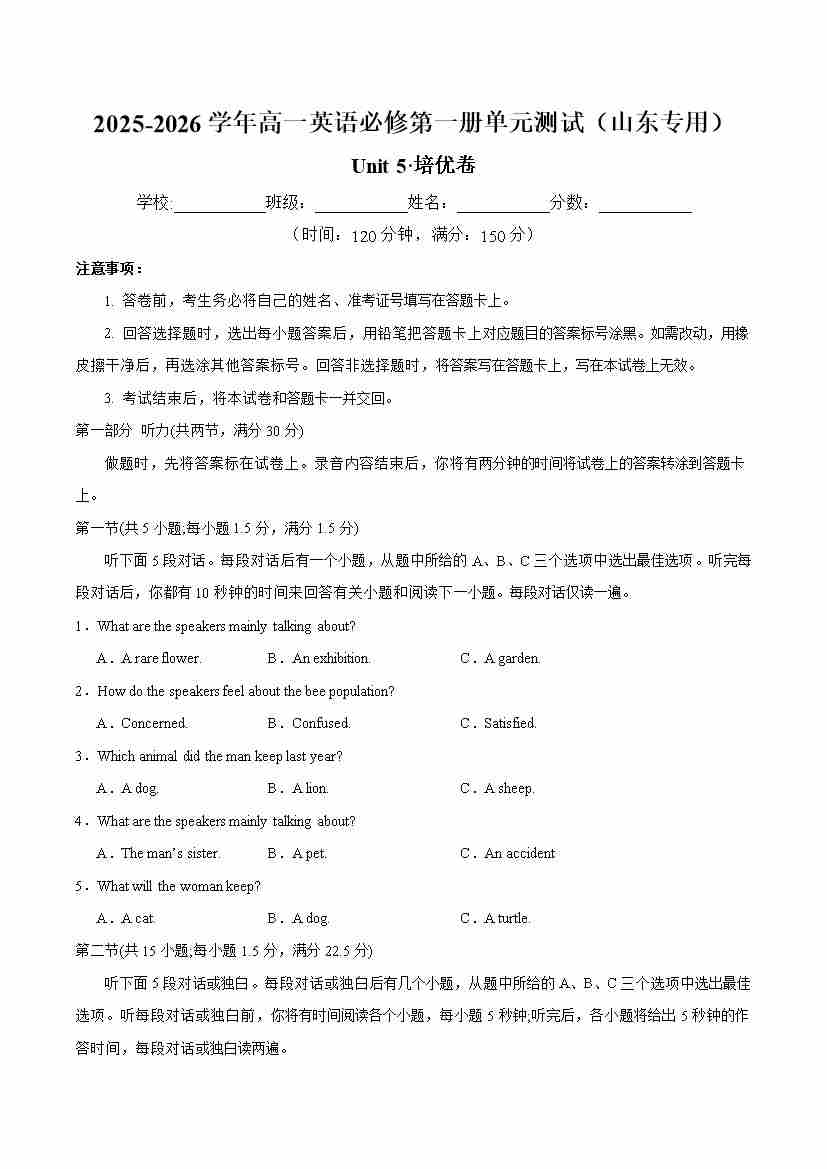 首页 > 全部 > 单元地区卷 > 高一英语必修第一册Unit5单元测试·培优卷(考试版 A4)