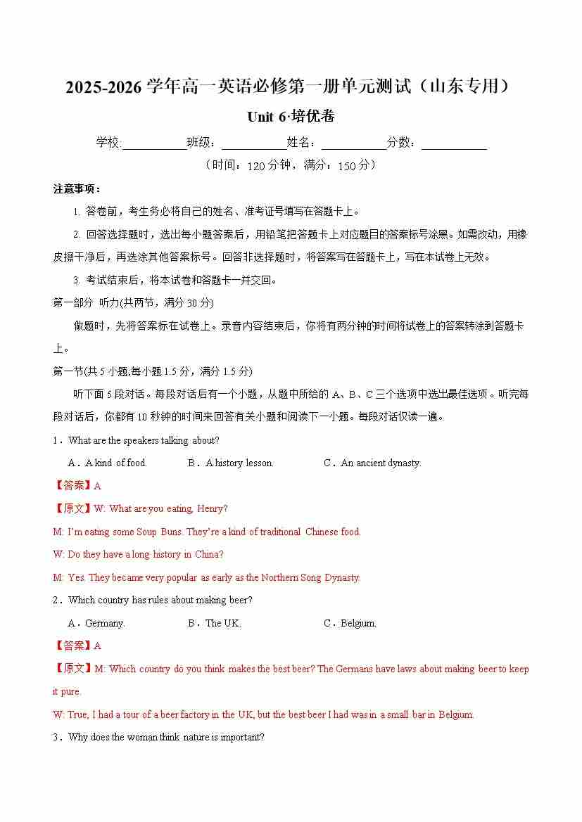 首页 > 全部 > 单元地区卷 > 高一英语必修第一册Unit6单元测试·培优卷(教师版)