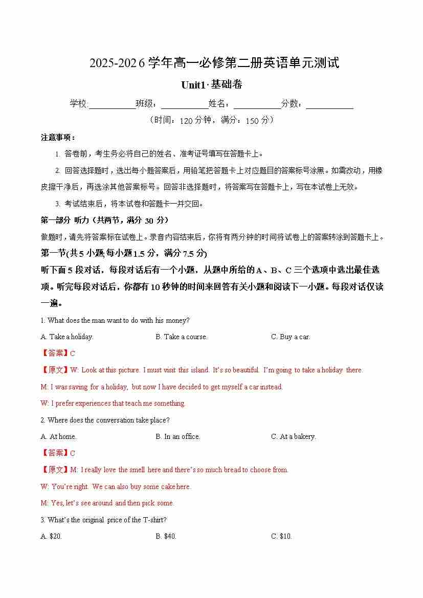 首页 > 全部 > 单元测试 > 高一英语必修第二册Unit1单元测试·基础卷(教师版)