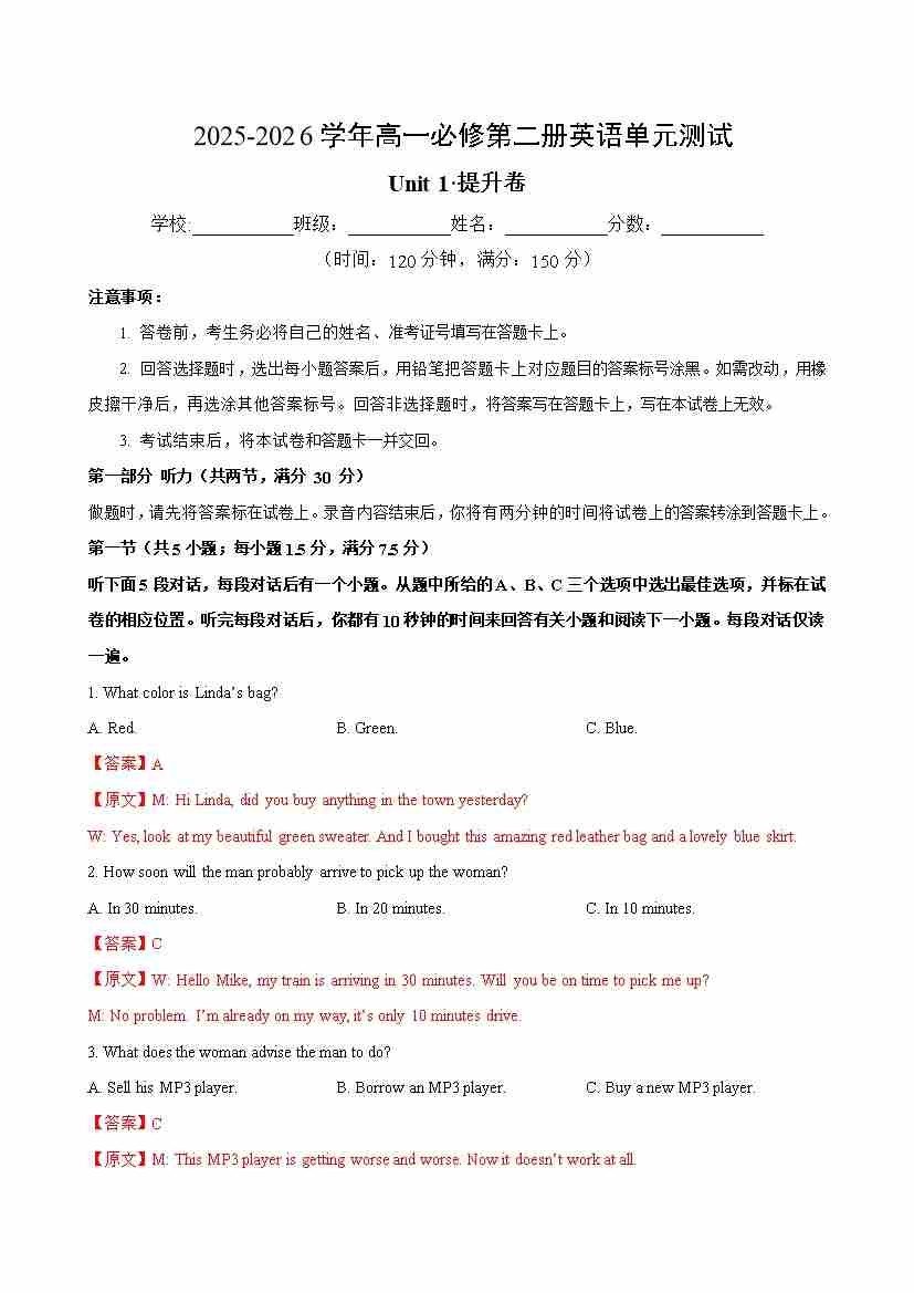 首页 > 全部 > 单元测试 > 高一英语必修第二册Unit1单元测试·提升卷(教师版)