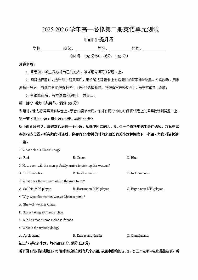 首页 > 全部 > 单元测试 > 高一英语必修第二册Unit1单元测试·提升卷(考试版A4)