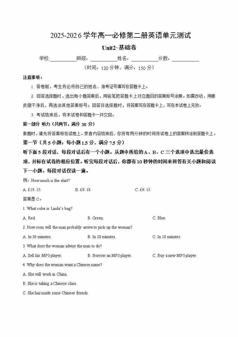 首页 > 全部 > 单元测试 > 高一英语必修第二册Unit2单元测试·基础卷(考试版A4)