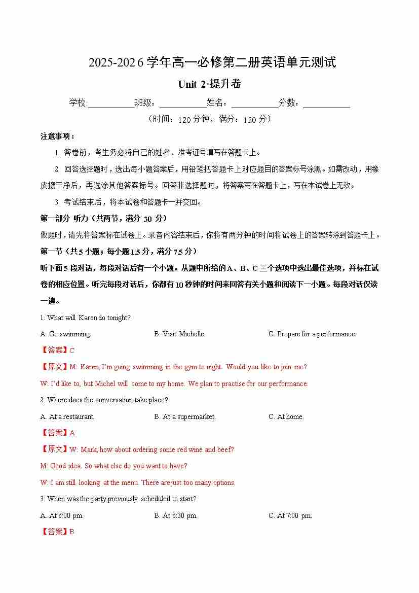 首页 > 全部 > 单元测试 > 高一英语必修第二册Unit2单元测试·提升卷(教师版)