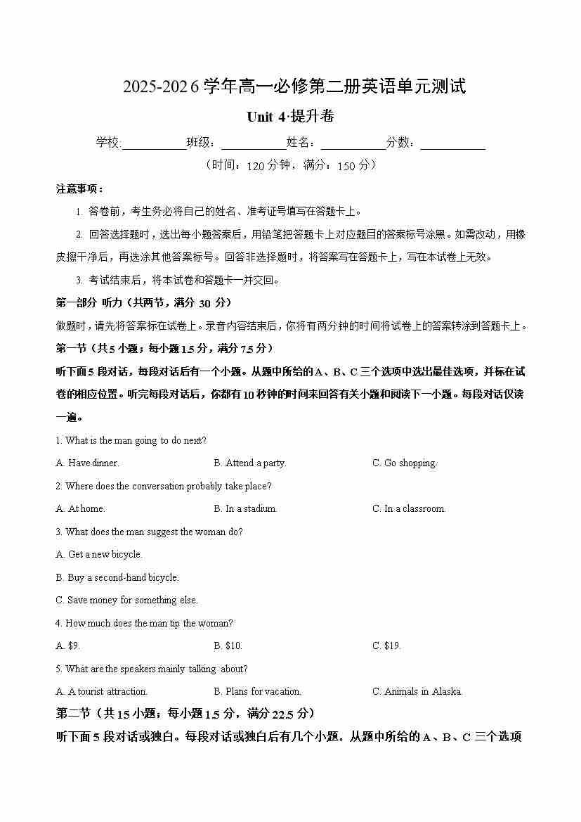 首页 > 全部 > 单元测试 > 高一英语必修第二册Unit4单元测试·提升卷(考试版A4)