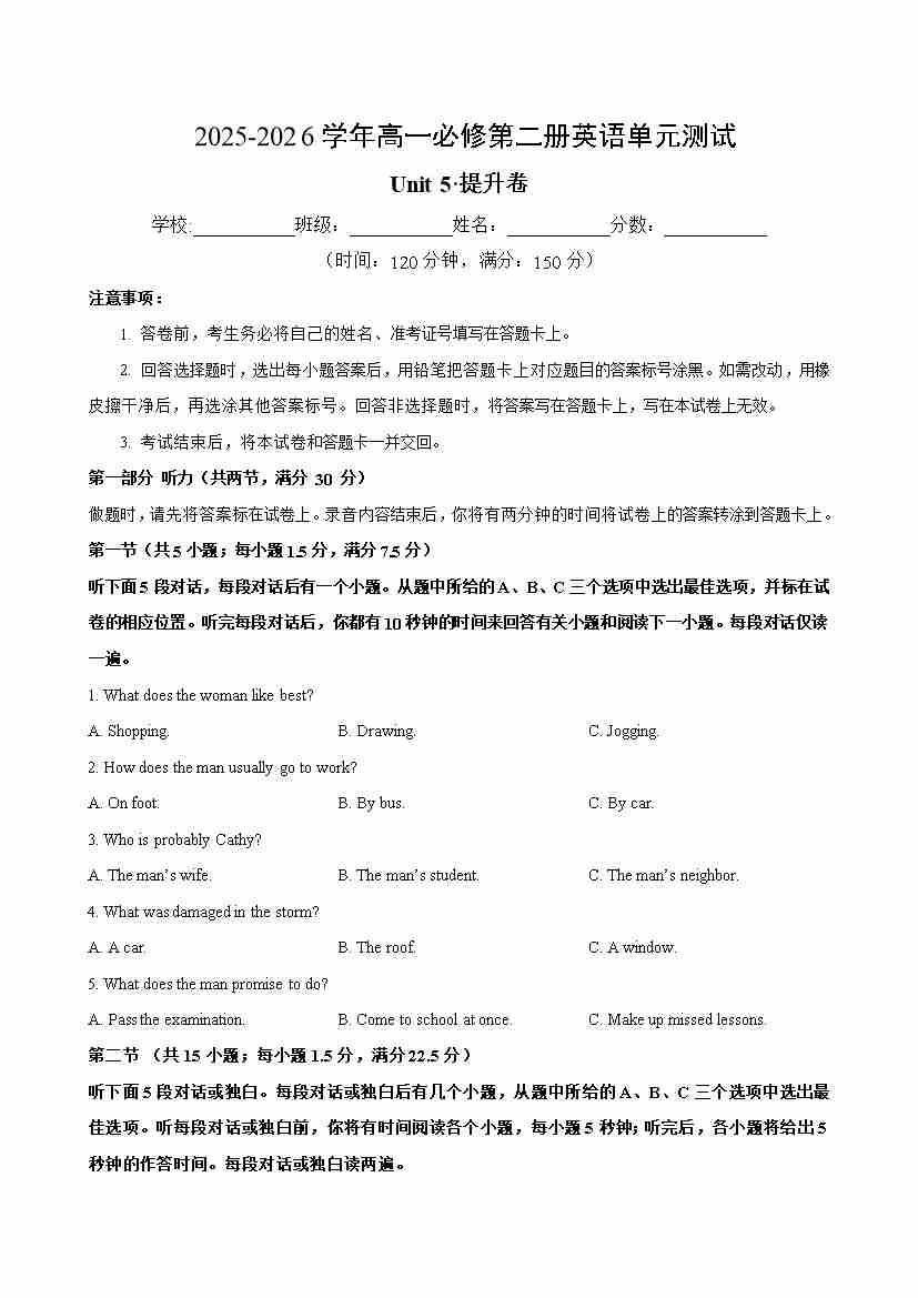 首页 > 全部 > 单元测试 > 高一英语必修第二册Unit5单元测试·提升卷(考试版A4)