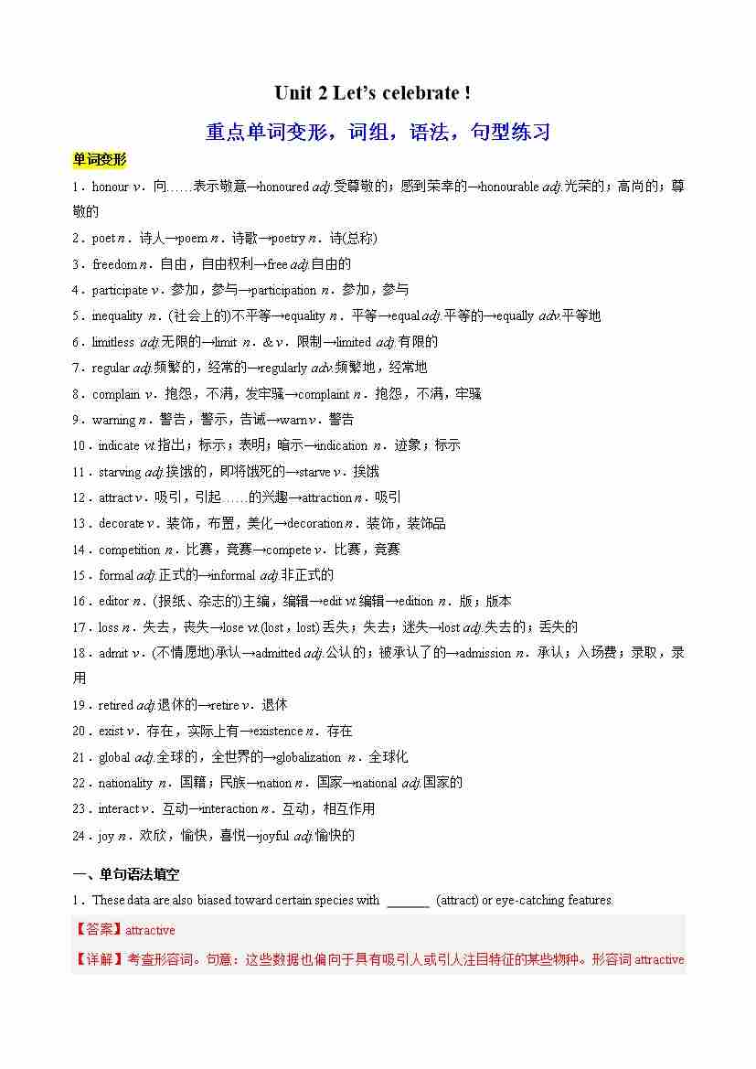首页 > 全部 > 专项练习 > Unit 2 Let’s celebrate 重点单词变形,语法,短语,句型练习(教师版)