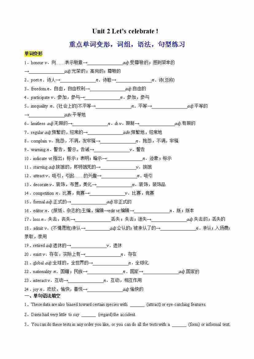 首页 > 全部 > 专项练习 > Unit 2 Let’s celebrate 重点单词变形,语法,短语,句型练习(学生版)