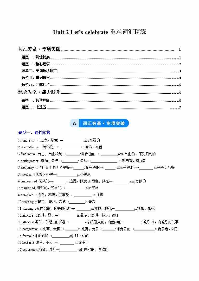 首页 > 全部 > 重难点词汇 > Unit 2 Let’s celebrate(重难词汇精练)(学生版)