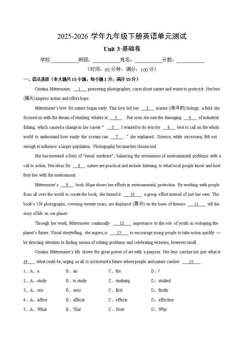 九年级英语下册Unit3单元测试·基础卷(解析版)