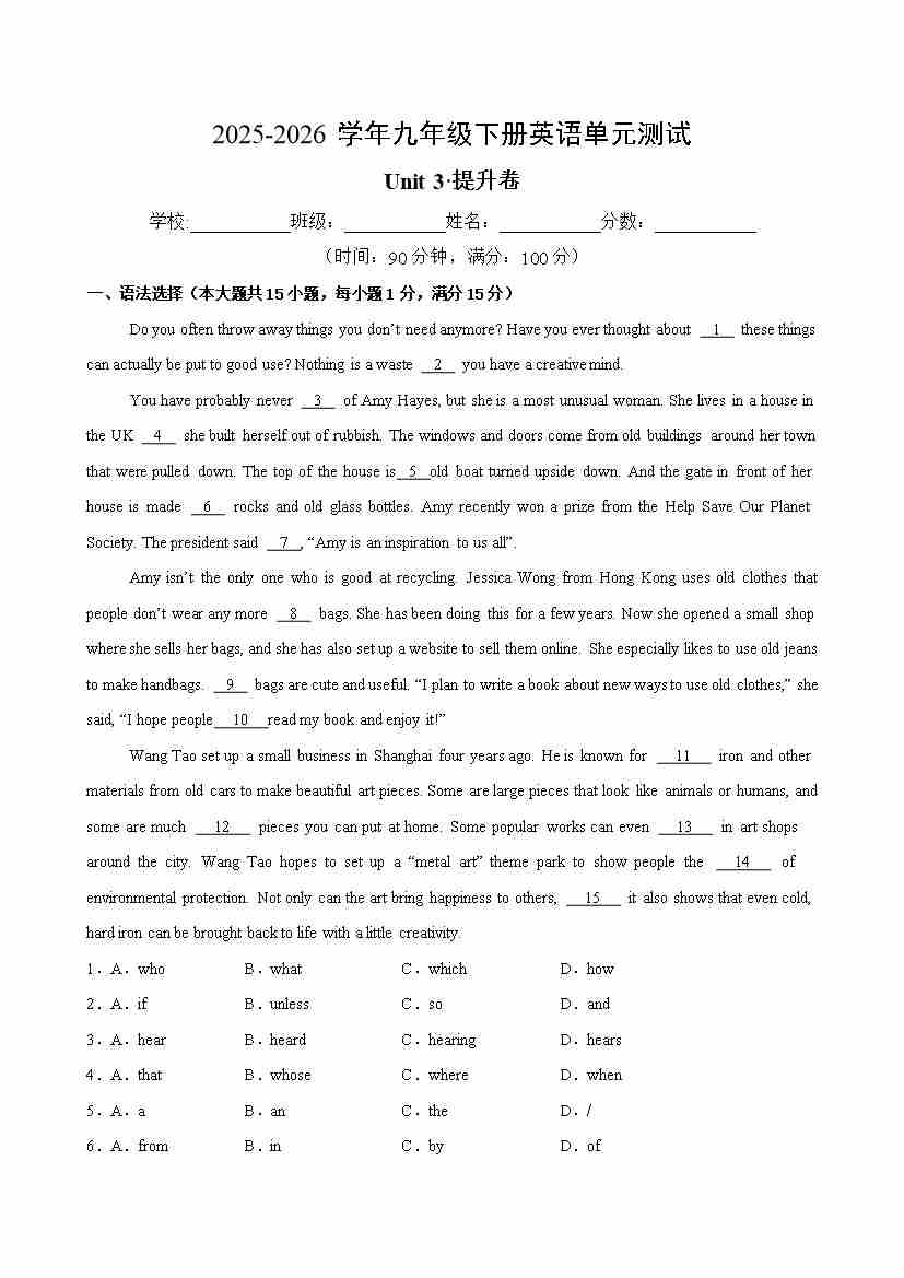 九年级英语下册Unit3单元测试·提升卷(原卷版)