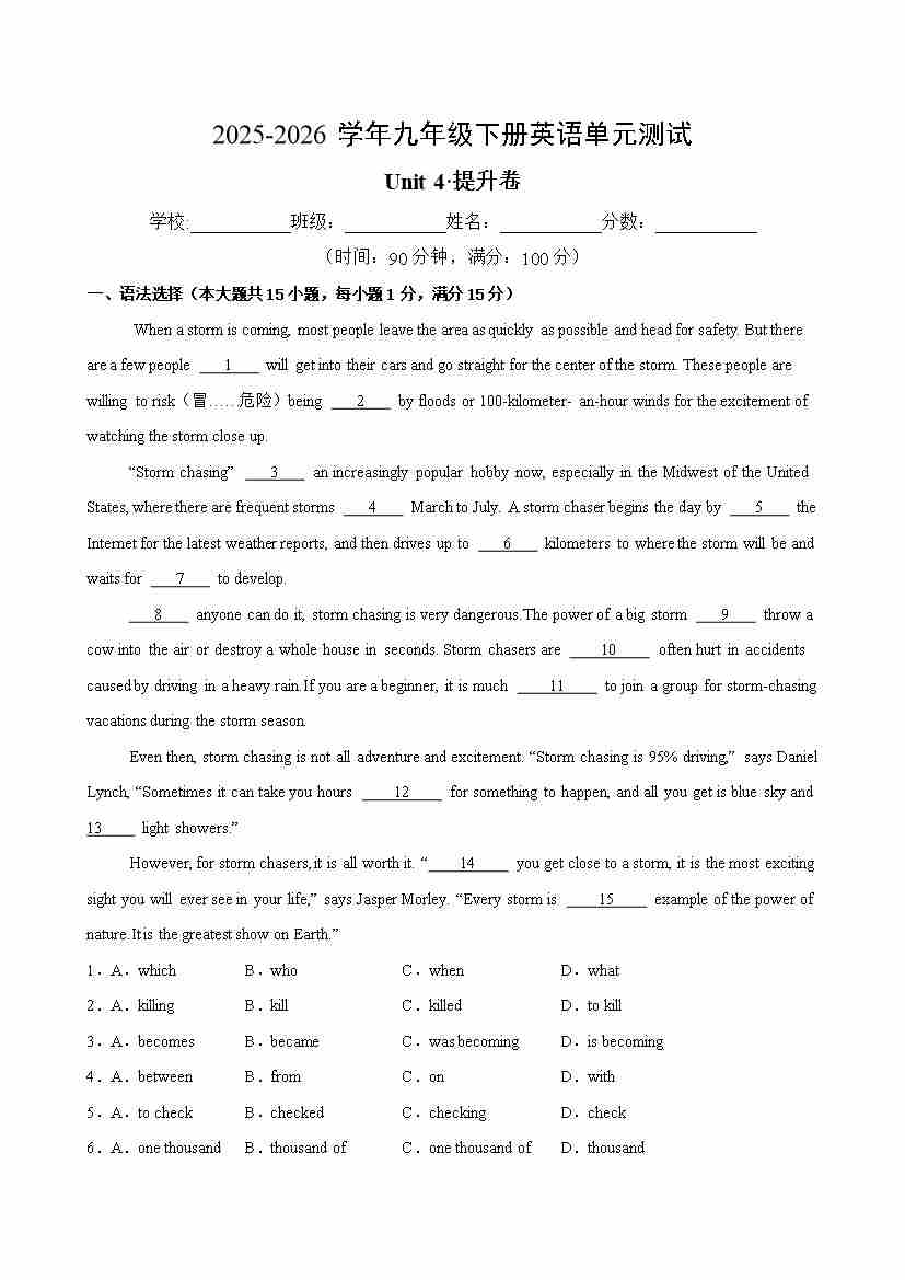 九年级英语下册Unit4单元测试·提升卷(原卷版)