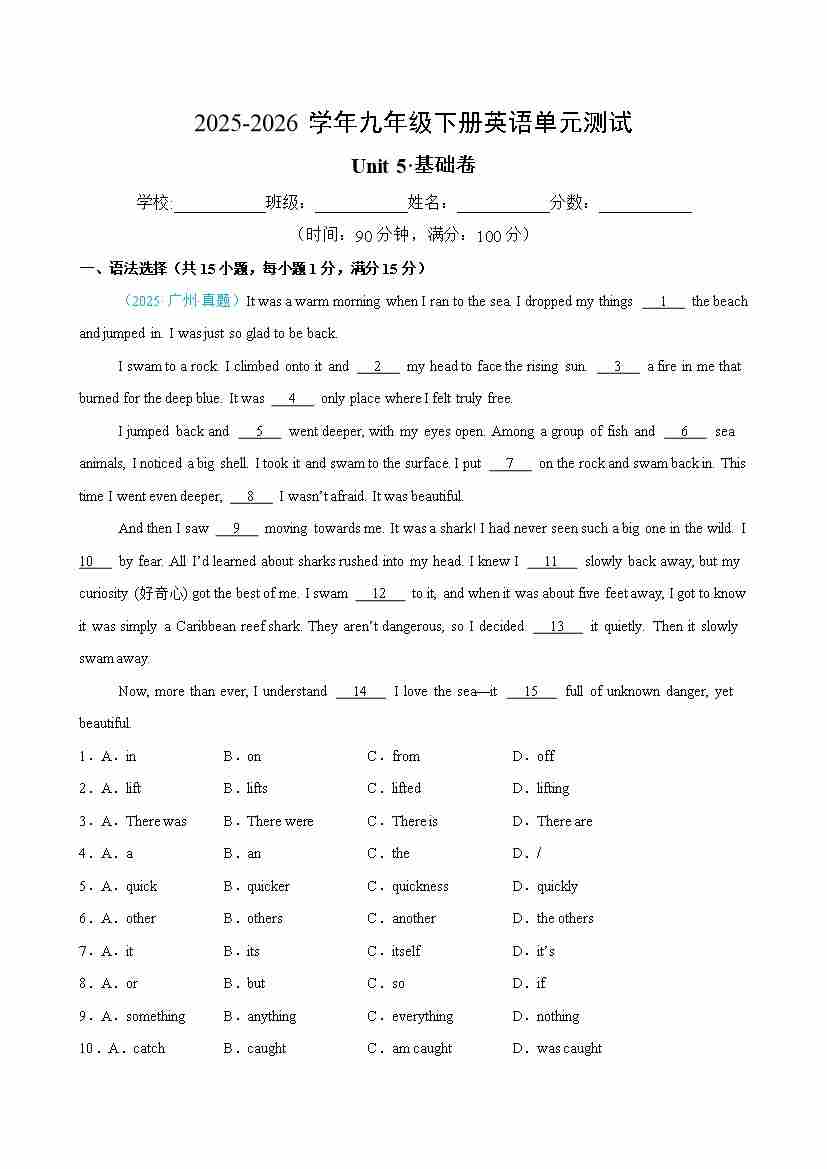 九年级英语下册Unit5单元测试·基础卷(解析版)