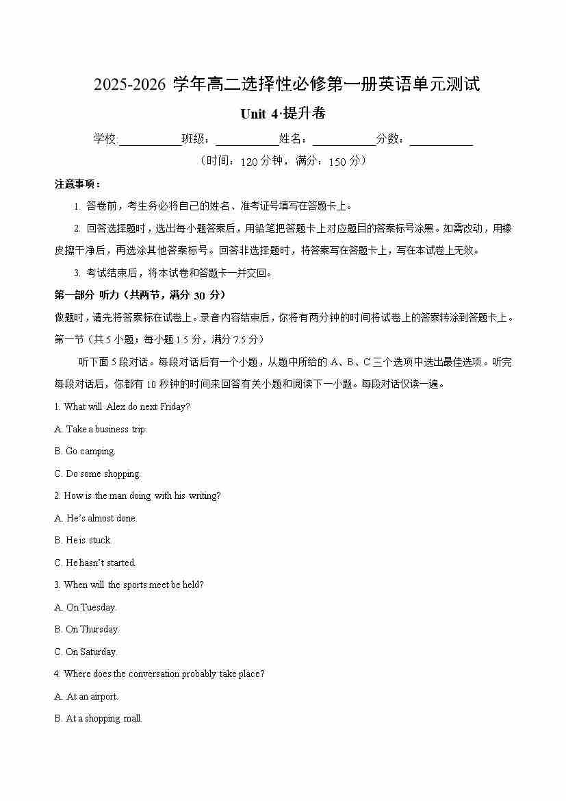 首页 > 全部 > 单元测试 > 高二英语选择性必修第一册Unit 4 单元测试·提升卷(考试版A4)