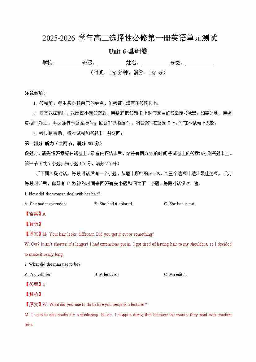 首页 > 全部 > 单元测试 > 高二英语选择性必修第一册Unit 6 单元测试·基础卷(教师版)
