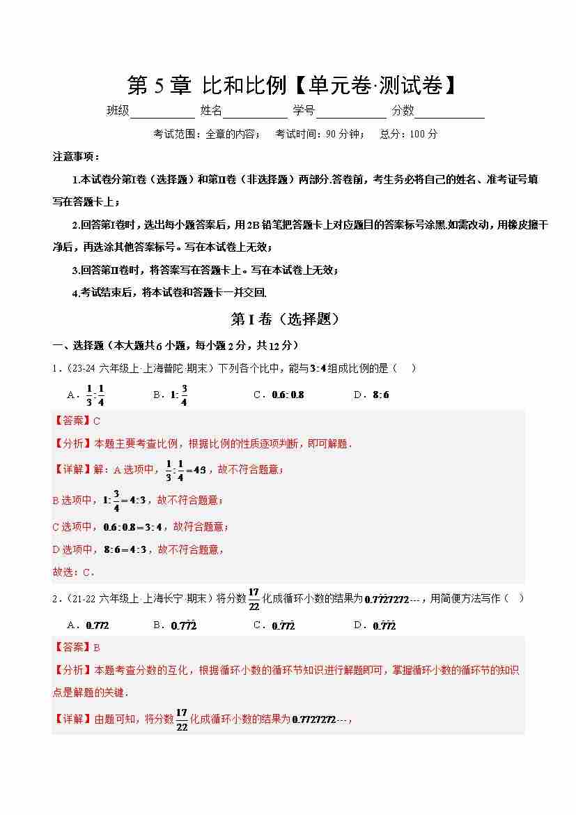 首页 > 全部 > 单元考点卷 > 第5章 比和比例(单元卷·测试卷)(教师版)
