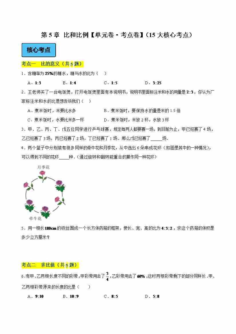 首页 > 全部 > 单元考点卷 > 第5章 比和比例(单元卷·考点卷)(15大核心考点)(学生版)