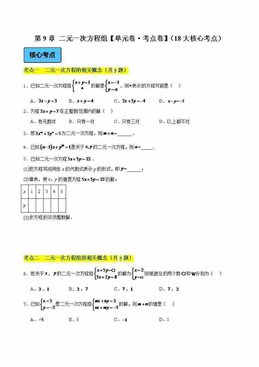 第9章 二元一次方程组(单元卷·考点卷)(18大核心考点)(学生版)