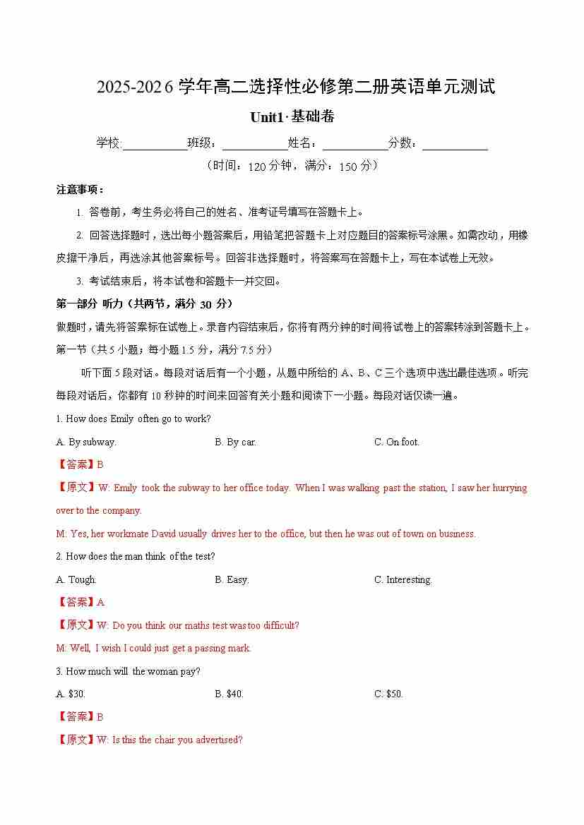 首页 > 全部 > 单元测试 > 高二英语选择性必修第二册Unit1单元测试·基础卷(教师版)