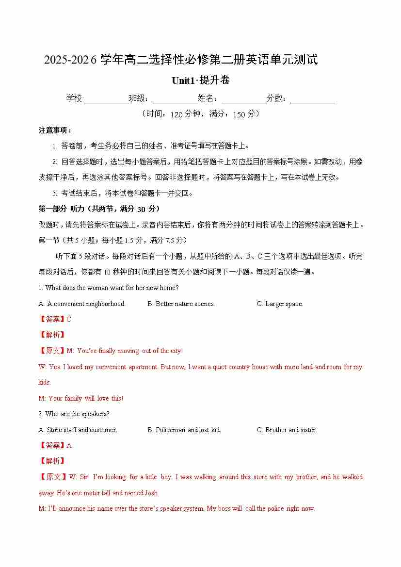 首页 > 全部 > 单元测试 > 高二英语选择性必修第二册Unit1单元测试·提升卷(教师版)