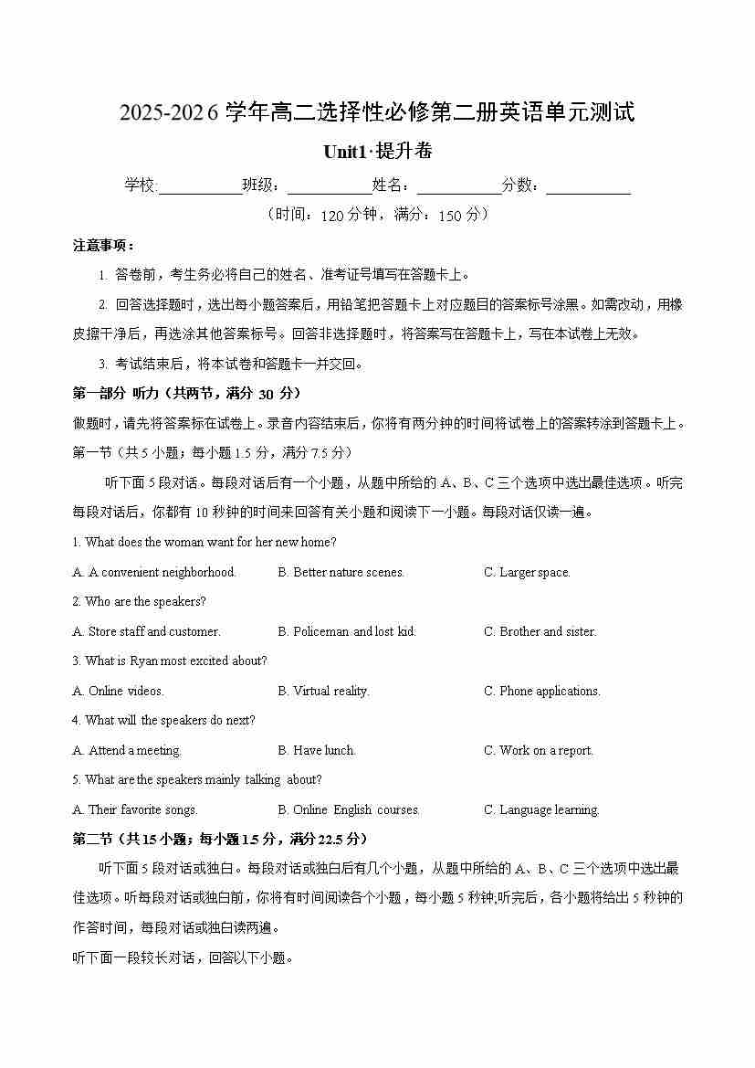 首页 > 全部 > 单元测试 > 高二英语选择性必修第二册Unit1单元测试·提升卷(考试版A4)