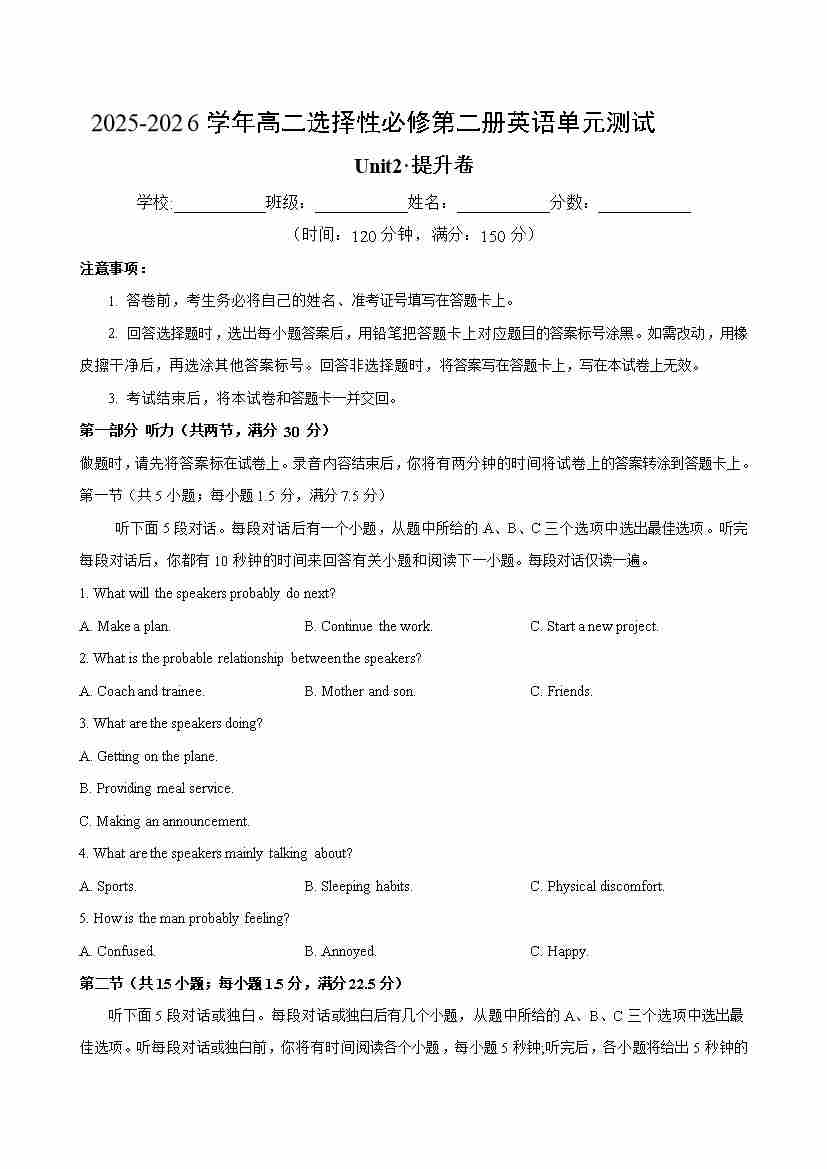 首页 > 全部 > 单元测试 > 高二英语选择性必修第二册Unit2单元测试·提升卷(考试版A4)