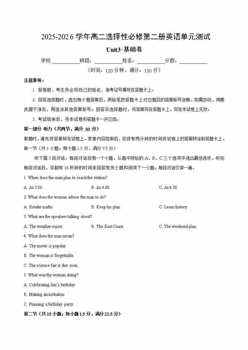 首页 > 全部 > 单元测试 > 高二英语选择性必修第二册Unit3单元测试·基础卷(考试版A4)