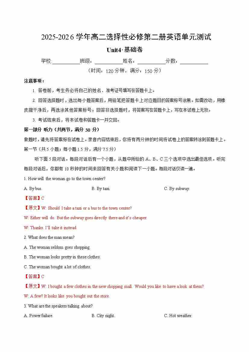 首页 > 全部 > 单元测试 > 高二英语选择性必修第二册Unit4单元测试·基础卷(教师版)