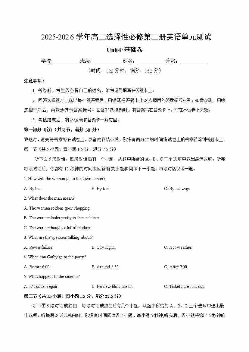 首页 > 全部 > 单元测试 > 高二英语选择性必修第二册Unit4单元测试·基础卷(考试版A4)