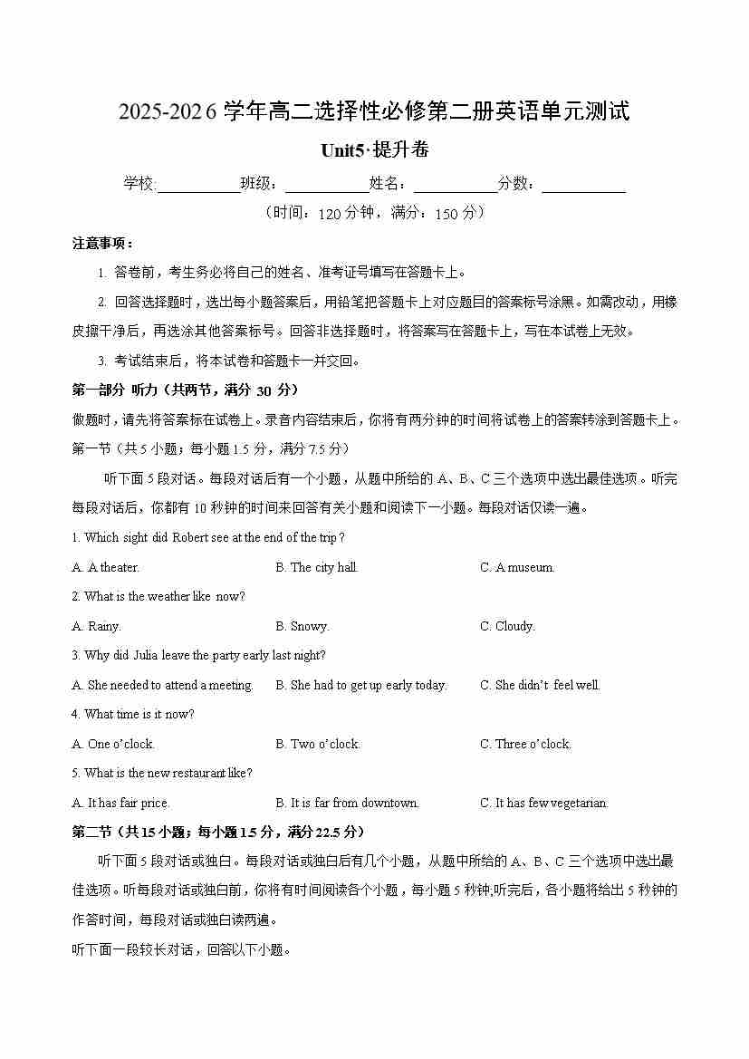 首页 > 全部 > 单元测试 > 高二英语选择性必修第二册Unit5单元测试·提升卷(考试版A4)