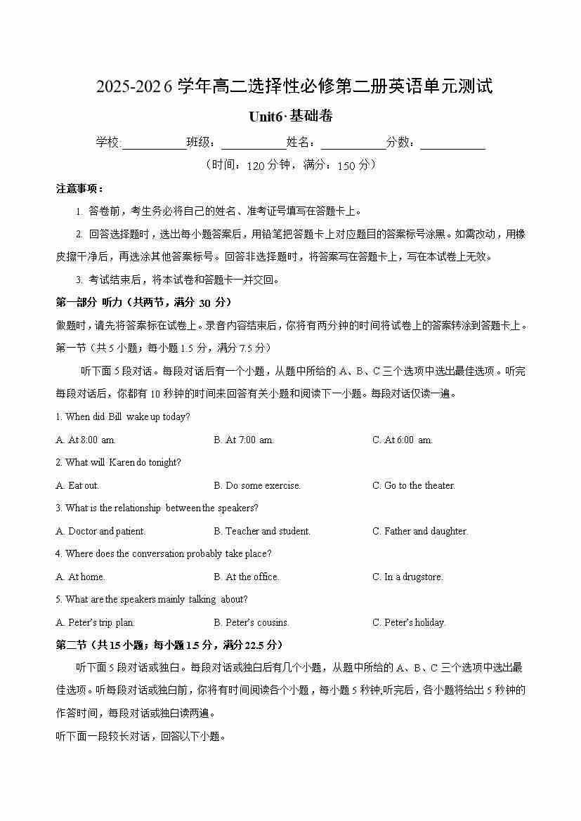 英语选择性必修第二册Unit6单元测试·基础卷(考试版A4)