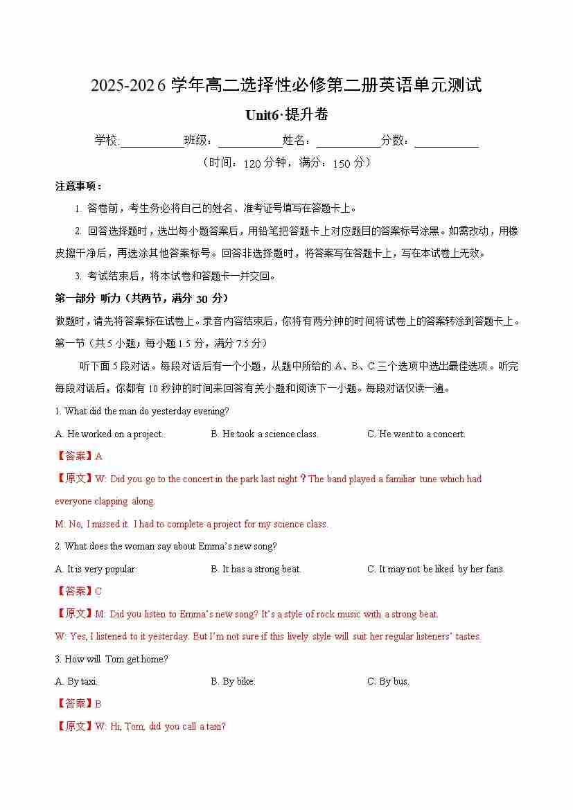 首页 > 全部 > 单元测试 > 英语选择性必修第二册Unit6单元测试·提升卷(解析版)
