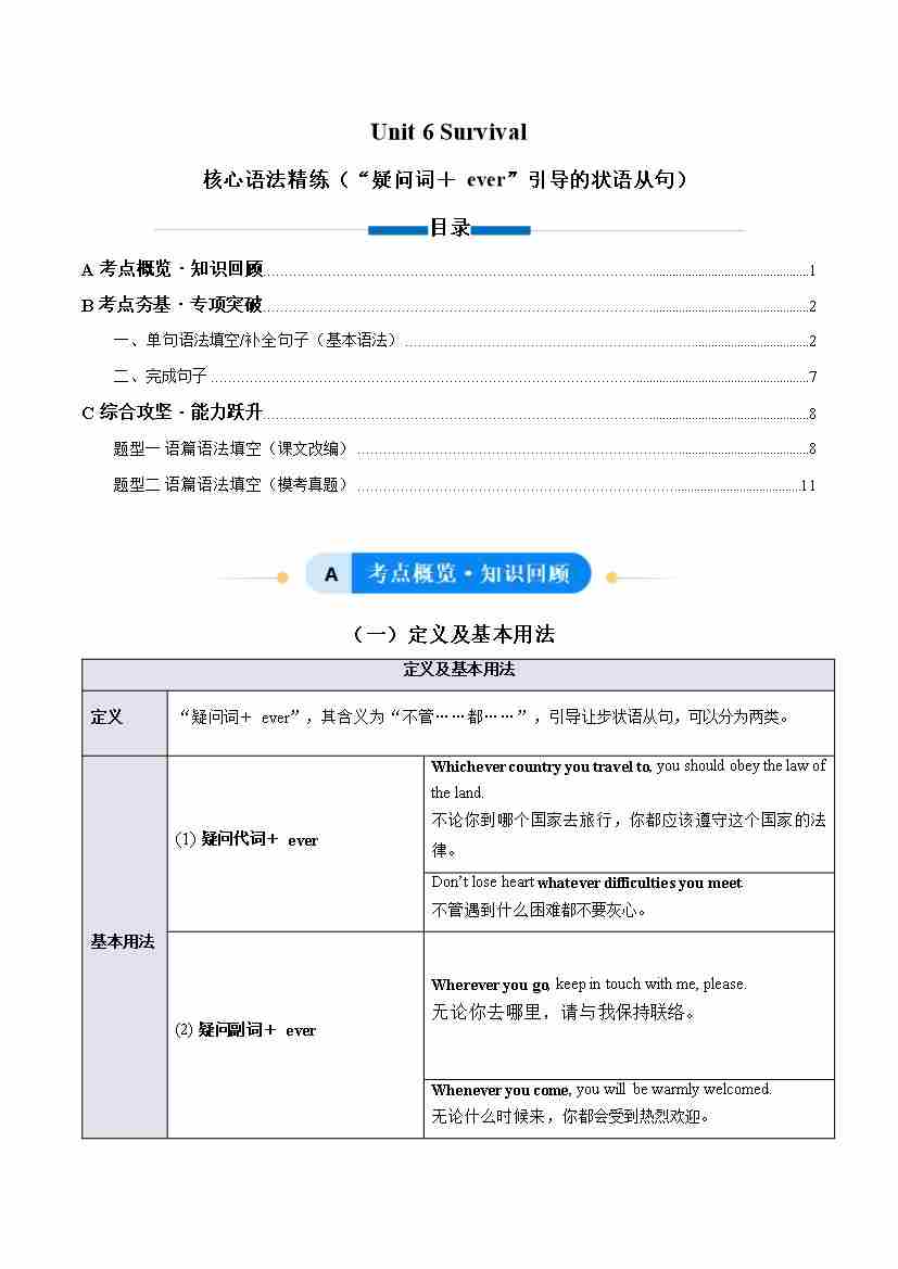 首页 > 全部 > 核心语法 > Unit 6 Survival “疑问词+ ever”引导的状语从句(单元核心语法精练)(解析版)