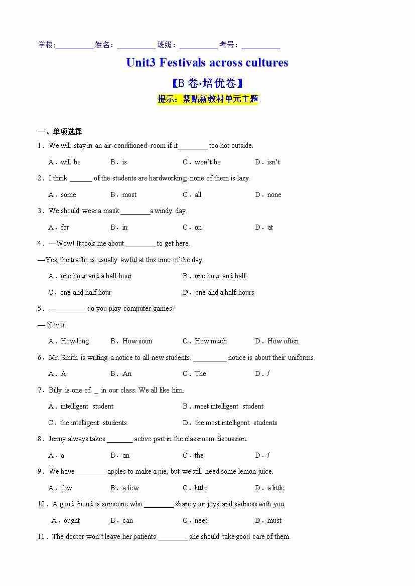 Unit3 Festivals across cultures (B卷·培优卷)(学生版)