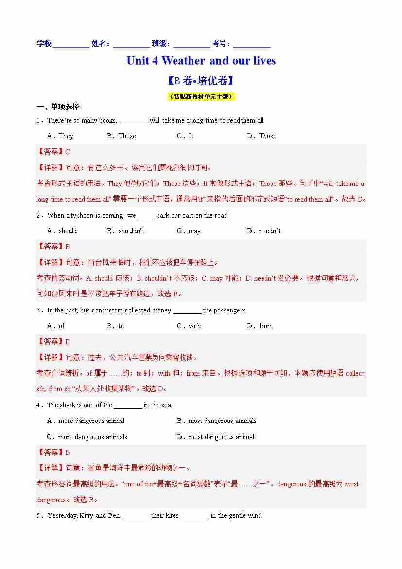 首页 > 全部 > 单元测试 > Unit 4 Weather and our lives (B卷·培优卷)(教师版)