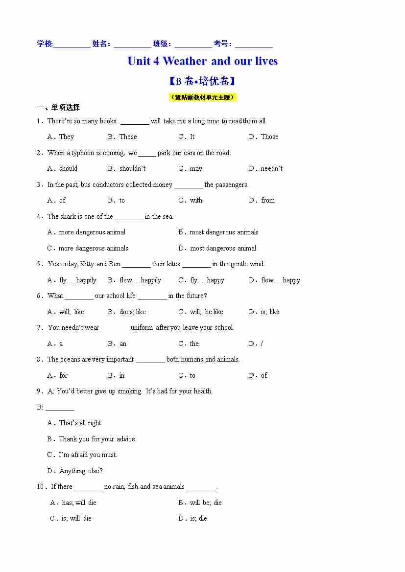 首页 > 全部 > 单元测试 > Unit 4 Weather and our lives (B卷·培优卷)(学生版)