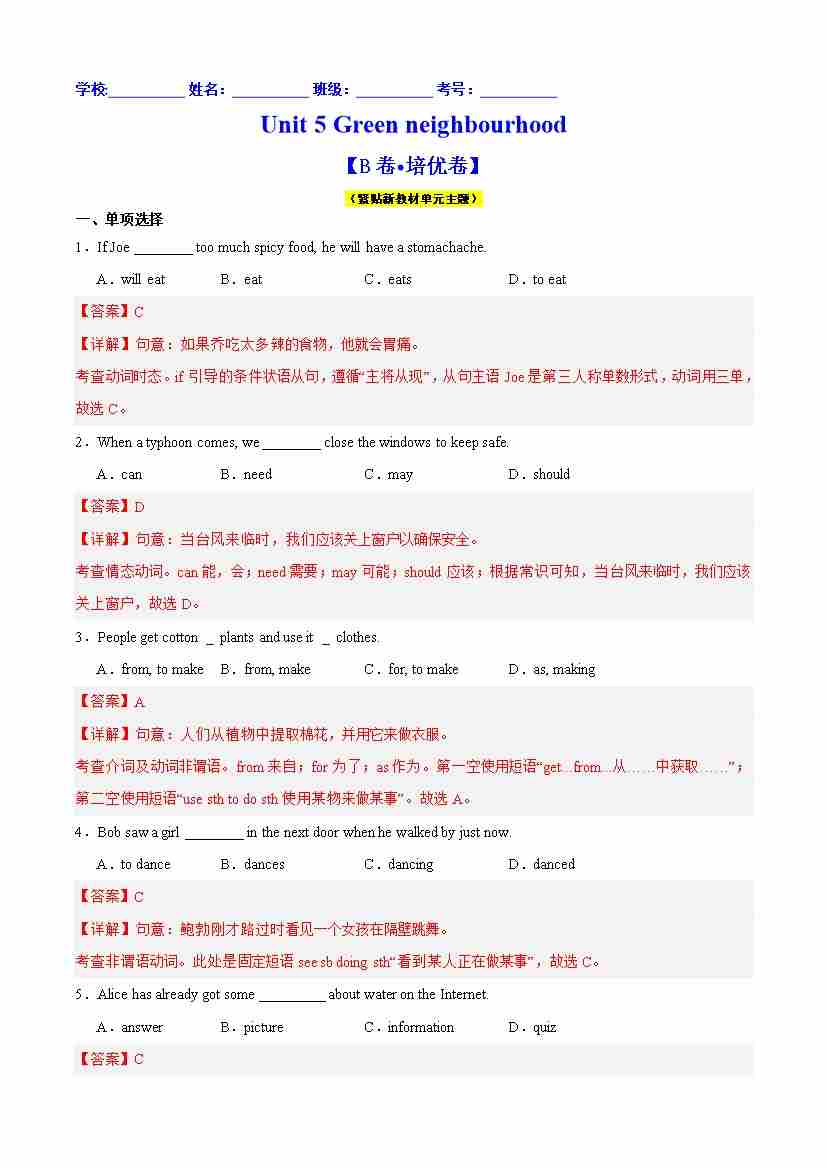 Unit 5 Green neighbourhood (B卷·培优卷)(教师版)